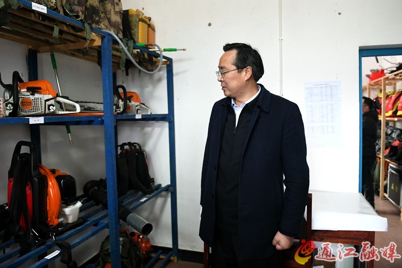寒冬腊月,位于松溪乡的黄柏林场场部雪花纷飞,四处白雪皑皑。来到林场场部,谭青松查看林场办公环境,检查森林防灭火设施装备和物资储备,与林场负责人交谈,详细了解林区面积、林下资源和干部职工巡山护林、开展森林防灭火工作等方面情况。
