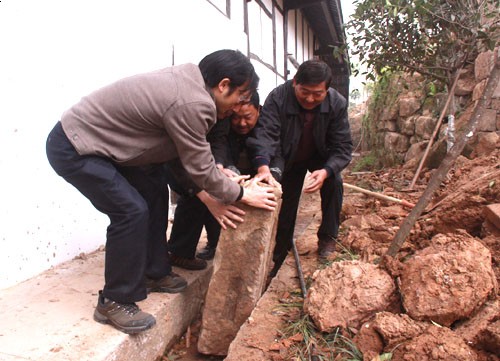 “来几个劳力,我们把这块搬走。”来不及歇息,刘显卫抹去额头的汗水,朝远处招呼人员,“一二起!”刘显卫和另外二人齐努力,将横卧沟内一米多长的条石立起来了。然后让人捡来砖头,利用条石下部两个角的支点反复垫砖、起高,最后利用沟沿石这个支点,终将条石搬出了沟内。