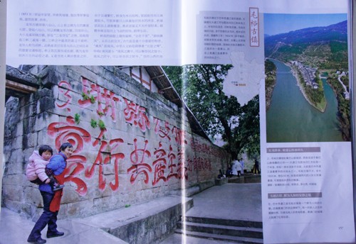 翻开该杂志第156、157页可以看到,两幅图片占据两页的大部,给人以强有力的视觉冲击力,其中,对“毛浴古镇,鲜为人知的安静之地”图片的介绍中,嘉靖门旁城墙上血红的红军标语夺人眼球,给人以震憾,讲述着当年红军横刀立马的峥嵘岁月;在远处的红军树下,一对新人正在拍摄婚纱照,描述着通江儿女如今美好的幸福生活。另一张“长龙卧水,被遗忘的水码头”图片中,毛浴古镇犹如一艘战舰,颇为壮观;而在一旁的文字说明中,介绍了毛浴古镇的地理位置,悠久的历史遗迹,重要的战略、经济地位等。