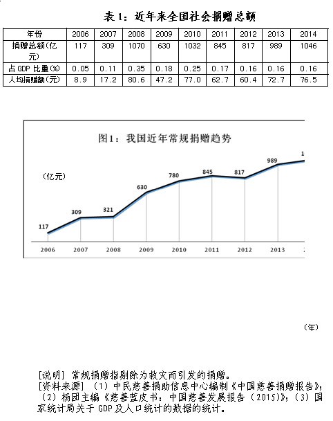 由表1、图1可见,近年来我国社会捐赠额增长迅猛,汶川特大地震期间(2008年)突破千亿规模,常规捐赠也一路猛增,2014年突破千亿,相当于2006年的近9倍。