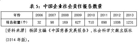 企业社会责任是来自市场体系对公益慈善的重要支持力量,不仅表现为企业捐赠,更体现企业对于劳工、消费者、环境、社区等方面的综合公益贡献,反映在定期发布的企业社会责任报告上。近年来,我国各类企业公开发布的社会责任报告从无到有、成倍增长。详见表5。