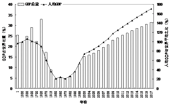 资料来源:2003年之前数据取自Angus Maddison, Contours of the World Economy, 1–2030 AD, Essays in Macro-Economic History, Oxford University Press, p. 379, table A.4; p. 382, table A.7;2004年以后数据系在2003年数据基础上,按照世界银行不变价国际美元GDP的相关增长速度推算,世界银行数据库:http://data.worldbank.org/,2019年3月18日下载.