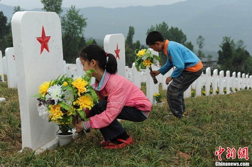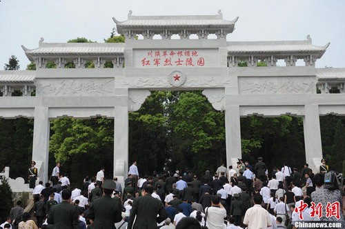 绿树掩映、青苔斑驳的红军烈士纪念碑高高伫立,纪念碑前挂上了黑色挽联,埋葬着7823名烈士的全国最大红军集墓静卧在纪念碑后。参加悼念活动的各界代表在纪念碑前整齐肃立。低婉的《献花曲》响起,十名礼兵抬着由解放军总政治部,四川省委、省政府,成都军区,参加活动的中央部委和老一辈无产阶级革命家亲属子女敬献的花篮,缓缓摆放到纪念碑底座前。刘奇葆、李立国、吴昌德、李世明、田修思、蒋巨峰走上前,轻轻整理花篮缎带,向革命先烈致敬。音乐停后,大家在烈士墓前肃立默哀,深切缅怀为革命事业英勇献身的红军烈士。《思念曲》在烈士陵园里回响,刘奇葆、李立国、吴昌德、李世明、田修思、蒋巨峰等手捧菊花,缓步向前,向烈士集墓献花、鞠躬,深情悼念长眠于此的革命先烈。
