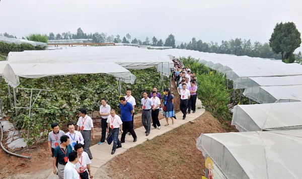 与会代表在恩阳区青木镇花包村葡萄产业园参观;