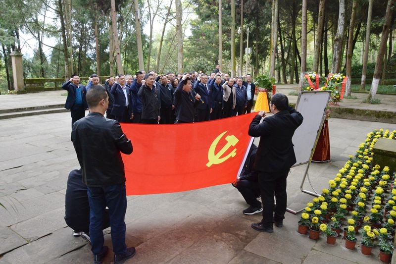 松柏苍翠,庄严肃穆。吴天泉一行在红四方面军英勇烈士墓碑前整齐列队,向革命烈士敬献花篮。全体党员干部面向鲜红的党旗,坚定地举起右手,重温入党誓词。