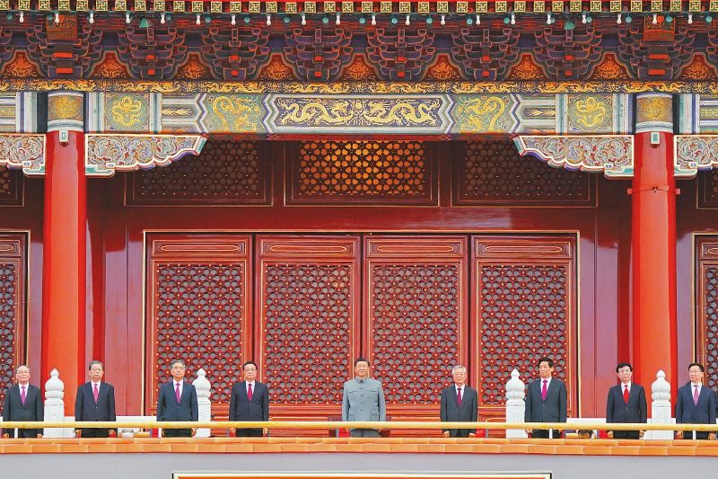 上午7时53分,在欢快的乐曲声中,习近平等党和国家领导人来到天安门城楼主席台,全场爆发出热烈掌声。