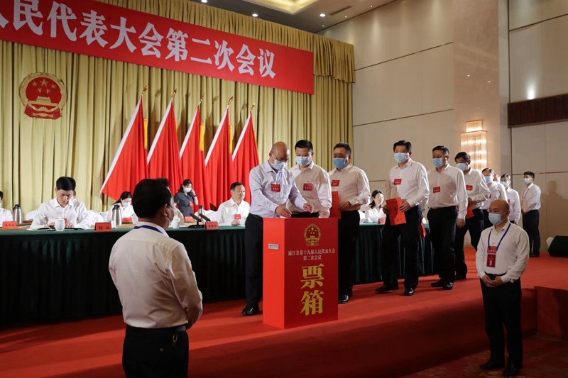 闭幕会前,进行了大会选举。会议通过无记名投票的方式,选举万津池、李思体、杨峥嵘、苟国平、苟毅五名同志为通江县第十九届人民代表大会常务委员会委员,票决确定了通江县2022年10个民生实事项目。新当选委员在与会代表的共同见证下进行了宪法宣誓。