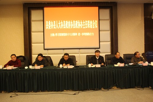 12月14日,县委办、县人大办、县政府办、县政协办召开以“学习贯彻党的十八大精神,进一步增强执行力”为主题的主任联席会议。县委常委、常务副县长岳映兵,县委常委、县委办主任闫丕川出席会议。